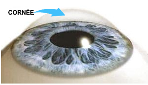 La cornée est la partie antérieure de l’œil, elle est transparente, d’une forme légèrement asphérique, ressemblant un peu à une lentille de contact.  Elle est située devant l’iris et la pupille. Elle représente les deux tiers de la puissance totale de l’œil. Sa fonction est de transmettre la lumière au cristallin et à la rétine, elle permet aux rayons de pénétrer dans l’œil, de les réfléchir ou de les réfracter. Elle est pourvue de liaisons nerveuses et est très sensible au contact.