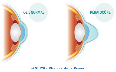Le kératocône est une maladie qui déforme la cornée. C’est une maladie progressive, elle commence par amincir l’épaisseur de la cornée, puis petit à petit la modifie pour lui faire prendre une forme conique, d’où son nom d’origine grecque qui signifie « cornée conique ». Compte tenu de cette déformation, des troubles de la vision apparaissent (mauvaise vision de loin, images multiples, vue brouillée, déformée, stries, hypersensibilité à la lumière). Sa progression est lente et imprévisible, elle peut rester stable durant plusieurs années et brusquement s’aggraver. Et elle ne touche pas nécessairement les deux yeux avec la même intensité. Elle est probablement d’origine génétique. Elle est très souvent diagnostiquée à l’adolescence.