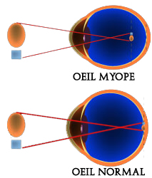 Dans un œil myope la cornée est déformée, on dit que l’oeil est trop long, les rayons lumineux convergent en avant de la rétine. L’image d’un objet vu par un œil myope est floue car elle se forme en avant de la rétine.